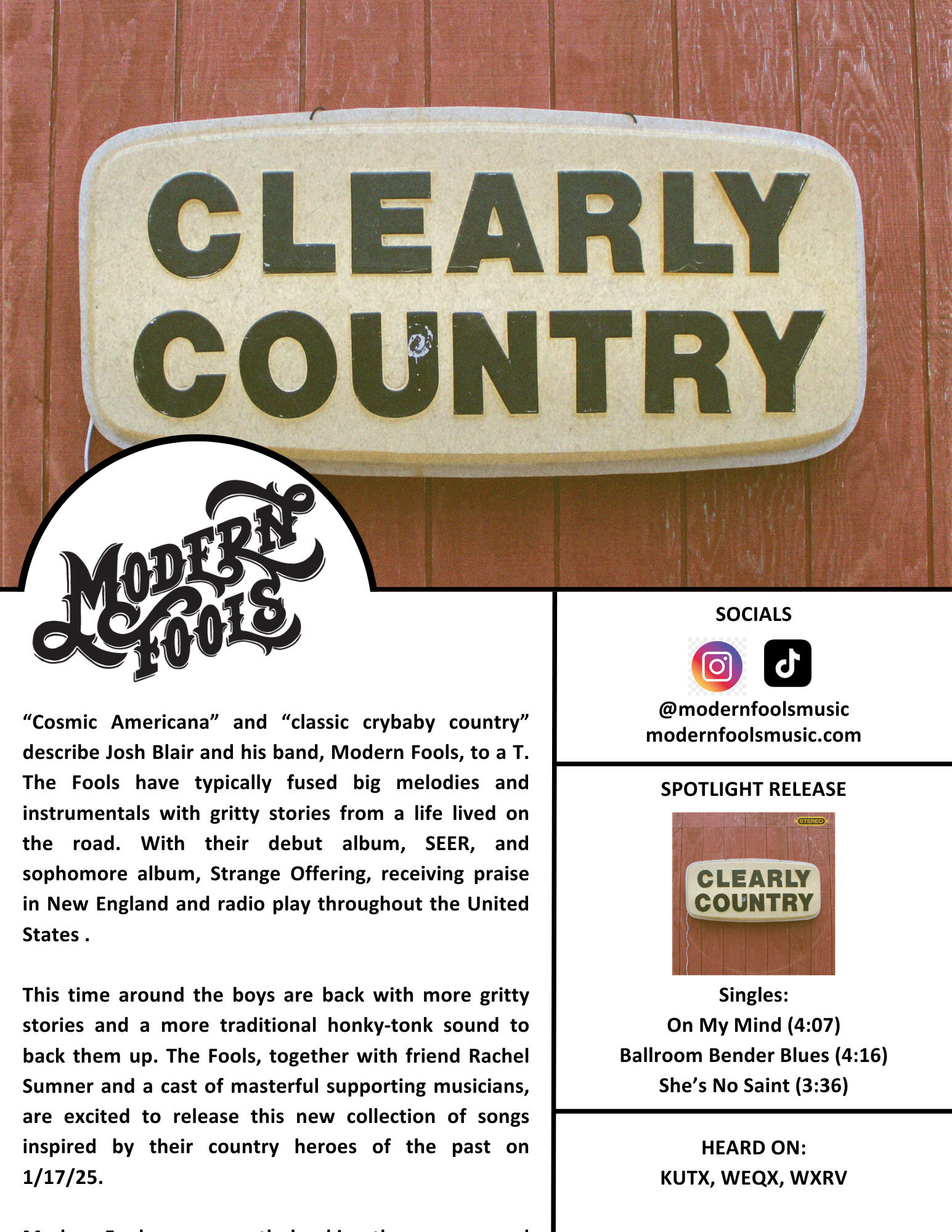 Despite their name, there's nothing particularly modern or foolish about the songs of this New Hampshire foursome. Unless you count devising their name by trying to fit letters into the Waffle House logo. Since that fateful, syrup-soaked morning, they've been refining a sound best described as "seriously retro, cosmic Americana", with songs that meld together the country rock of Gram Parsons with the song-craft and harmonies of Dr. Dog. The group's members have been making music together for between 1 and 16 years, depending on which combination you pick... But as Modern Fools, this iteration took shape in 2019, and has continued to hone in on their particular brand of dream country, while opening for the likes of Steve Earle, Ryan